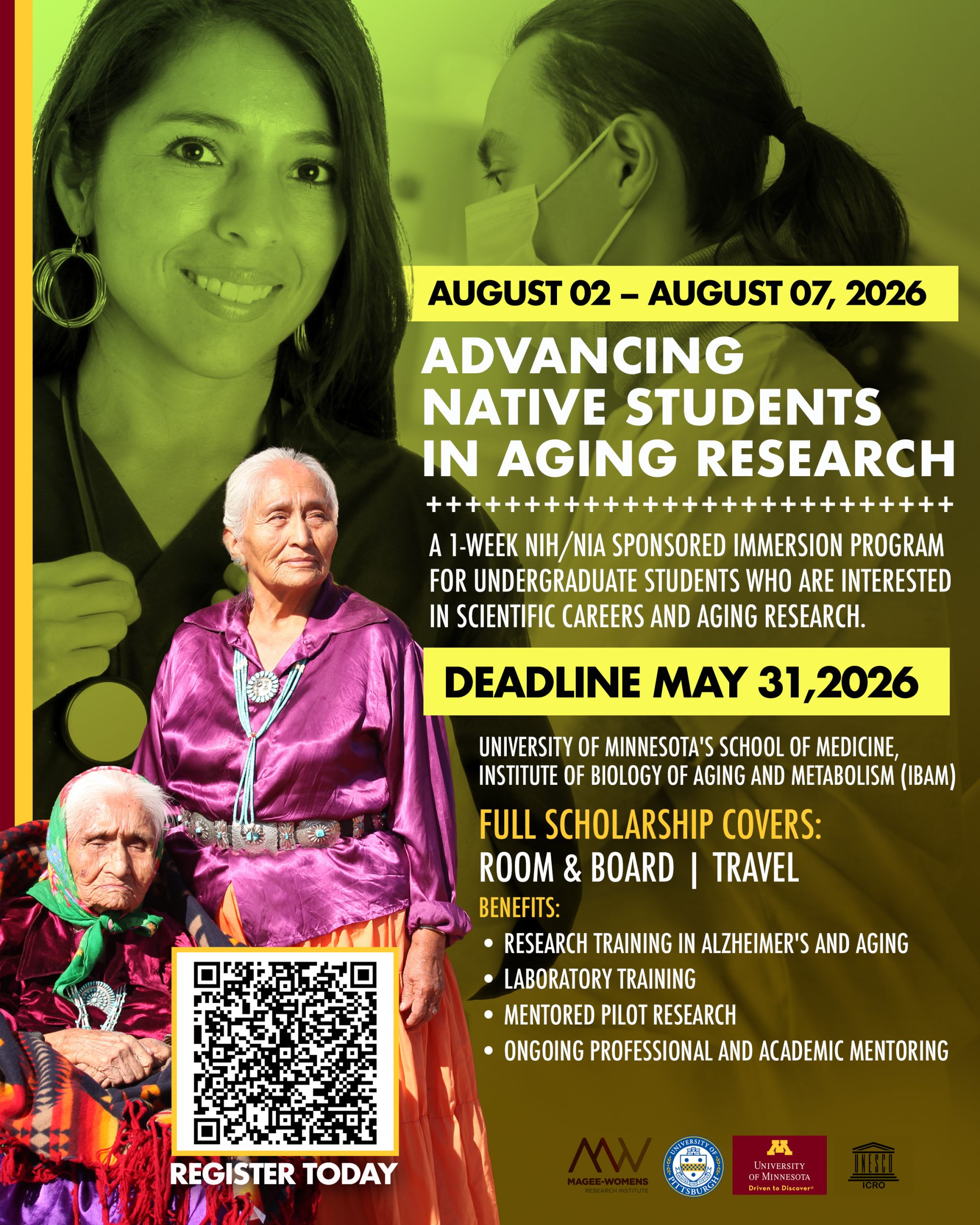 Advancing Native Students in Aging Research is designed for undergraduate students, especially those from American Indian, Alaska Native, and Native Hawaiian communities. This culturally grounded course combines short-term, intensive laboratory and didactic courses and mentored pilot research in fundamental, translational, clinical, and behavioral aspects of Alzheimer’s disease and related dementias (ADRD) and the mechanisms of aging with ongoing mentoring to ensure both the launching and the retention of these promising candidates in research careers.
