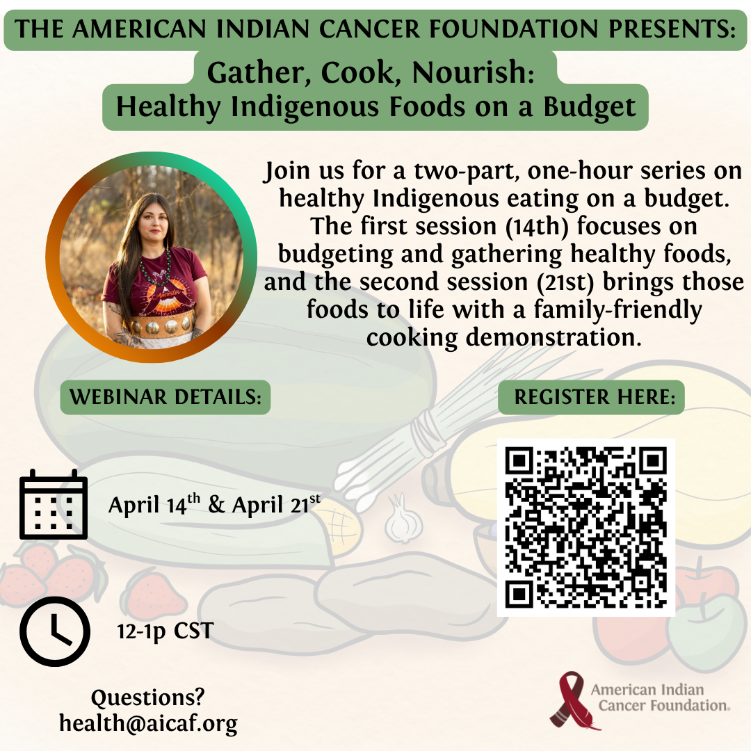 American Indian Cancer Foundation is hosting a two-part virtual series, “Gather, Cook, Nourish: Healthy Indigenous Foods on a Budget,” in partnership with an Indigenous Chef. This series will highlight culturally relevant approaches to nutrition, focusing on budgeting, gathering healthy foods, and bringing those foods to life through a family-friendly cooking demonstration.